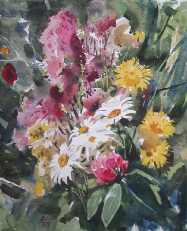Кошелев В.П. Желтые и белые ромашки, клевер 2007г. Бумага, акварель 53,5Х43 (518)