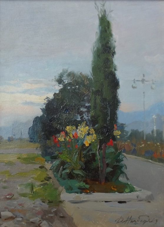 Налбандян Д.А. Цветы и кипарис 1969г. Катрон, масло 33Х25 (720)