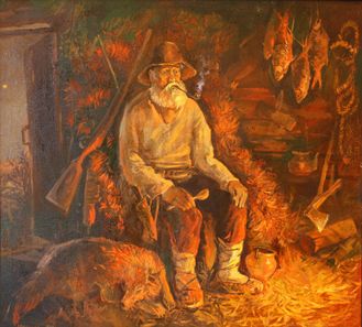 Мицник А.П. В охотничьей избушке 1999 г. Холст, масло 83Х92 (620)