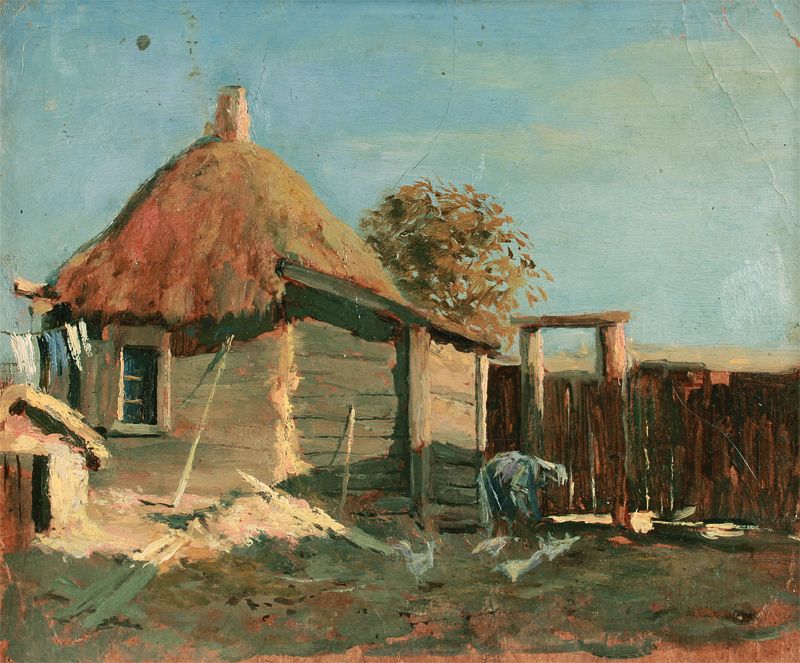 Губин В.С. Хата. картон, масло 21Х25 1940-е (149)