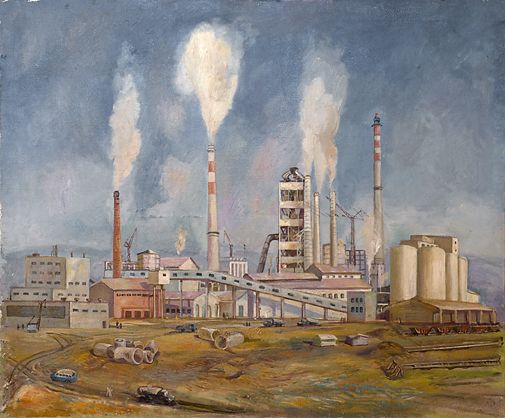 Калинин Г.Н. Реконструкция Невьянского цементного завода. холст, масло 100Х120 1982г (7)