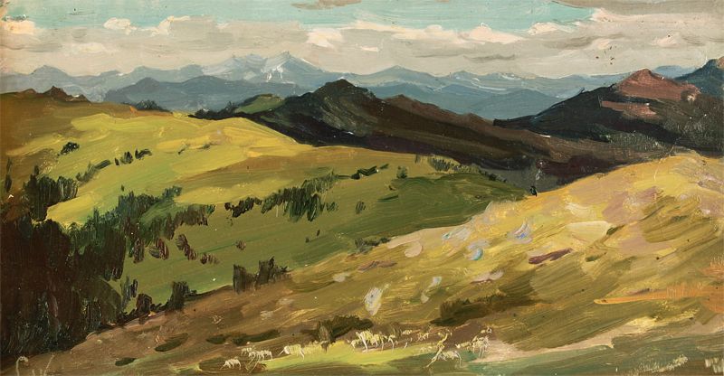 Акциновы Л. и А. Гор. Шория (верховье Томи). картон, масло 25Х46 1963г (184)