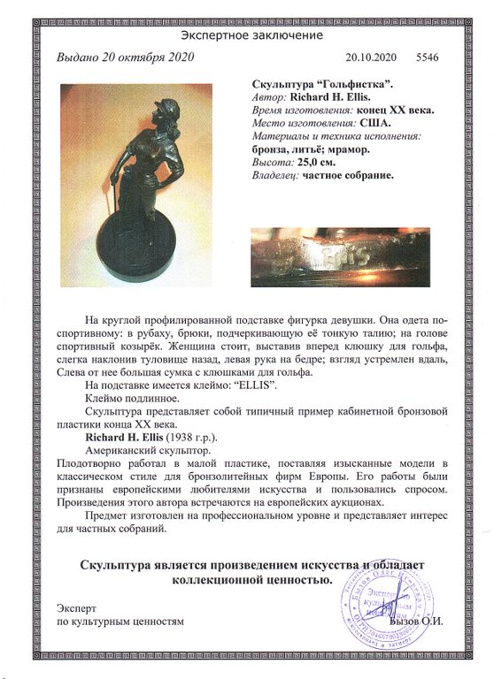 Richard H. Ellis Гольфистка. Конец ХХ в. США. Бронза, мрамор, литьё. Высота 25 см (1091) Оформить заказ Richard H. Ellis Гольфистка. Конец ХХ в. США. Бронза, мрамор, литьё. Высота 25 см (1091) Richard H. Ellis Гольфистка. Конец ХХ в. США. Бронза, мрамор, литьё. Высота 25 см (1091) Описание Описание На работу имеется экспертное заключение
