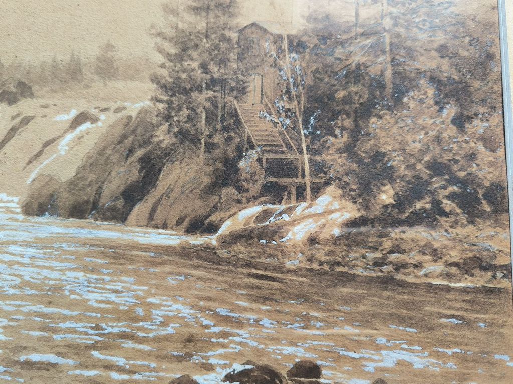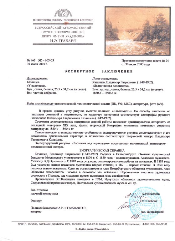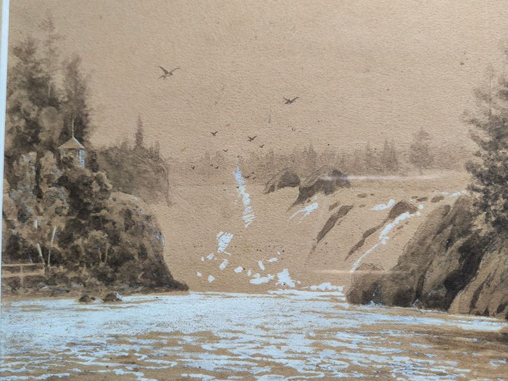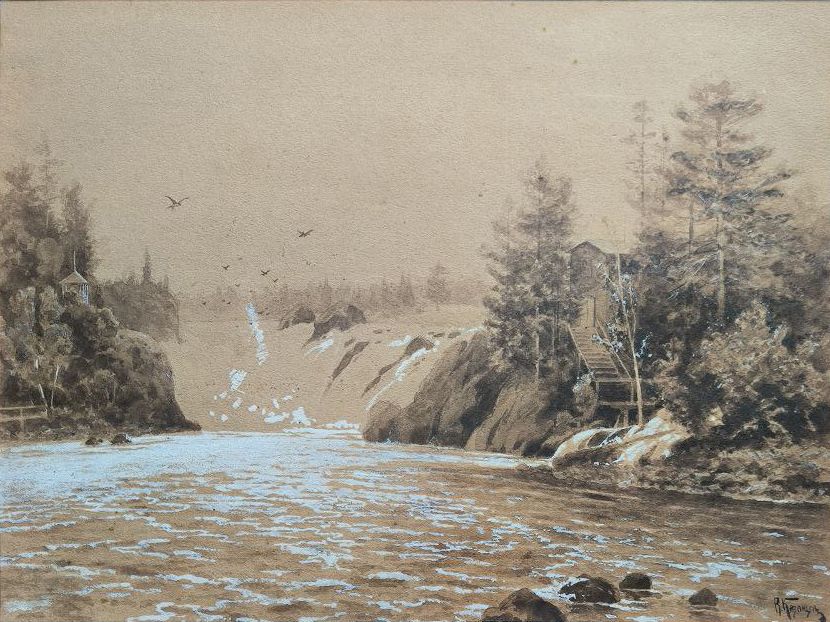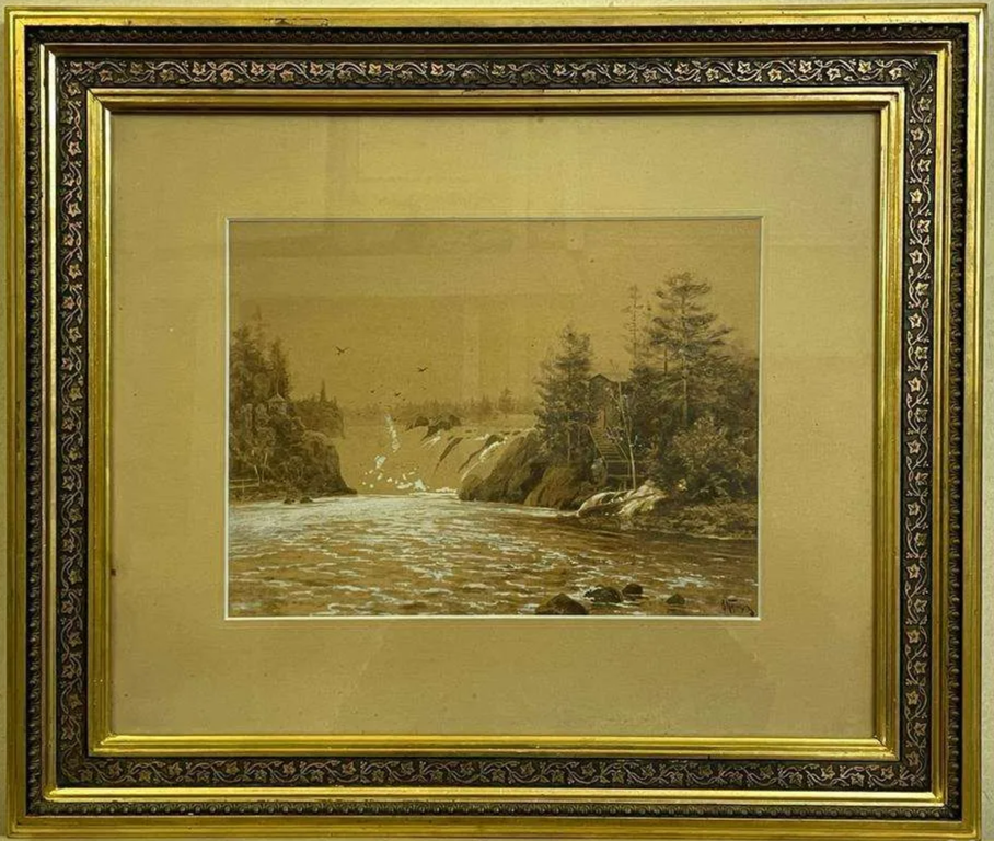 Казанцев В.Г. Ласточки над водопадом 1880-е-1890-е гг. Бум., гр.кар., сепия, белила 25,5Х34,2 (в свету) (1229)